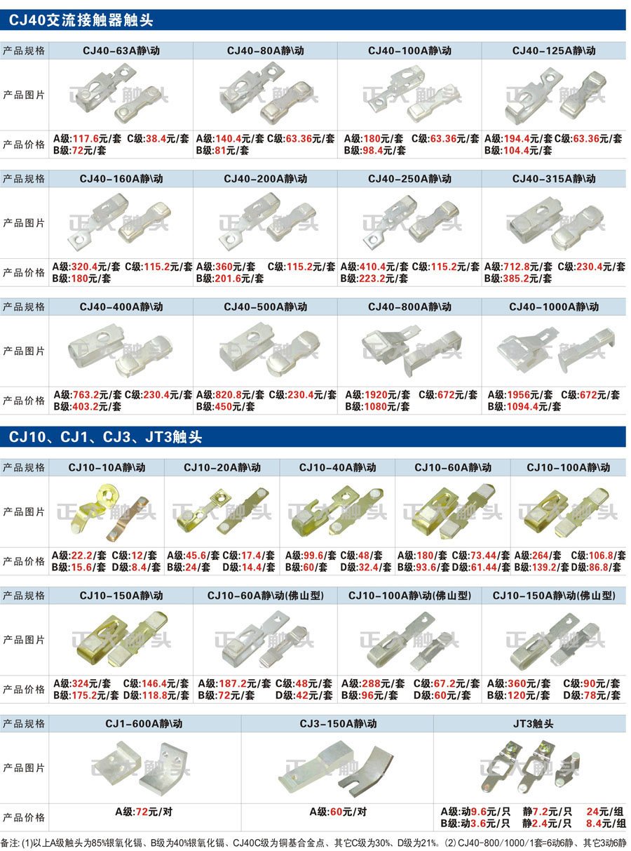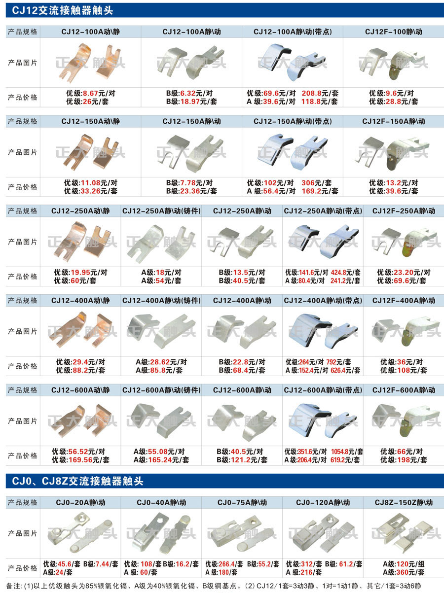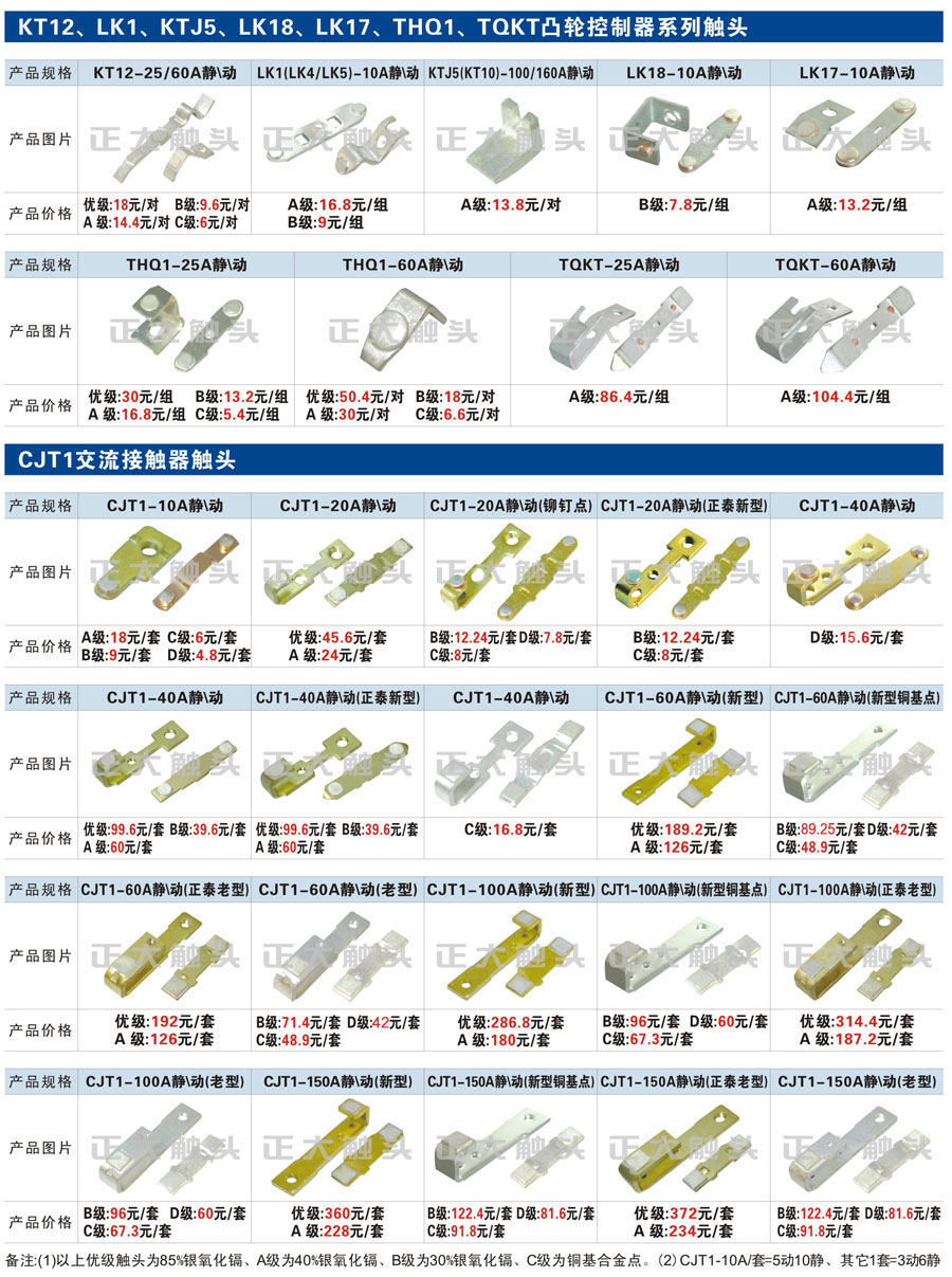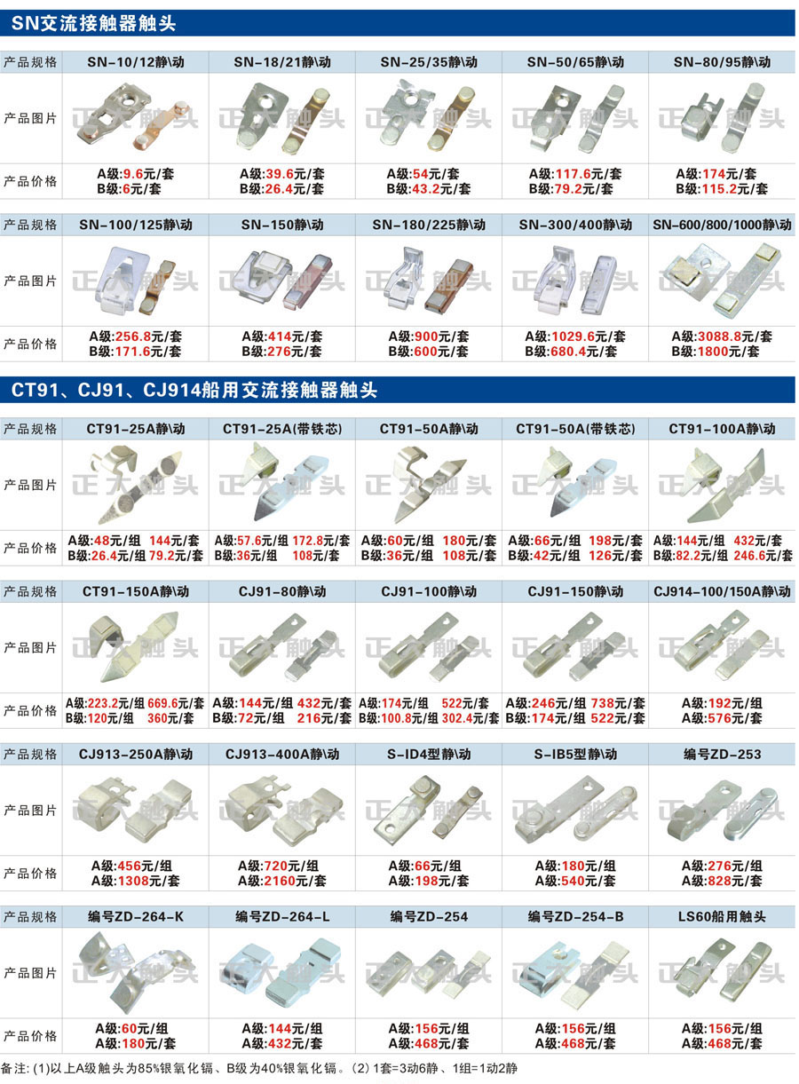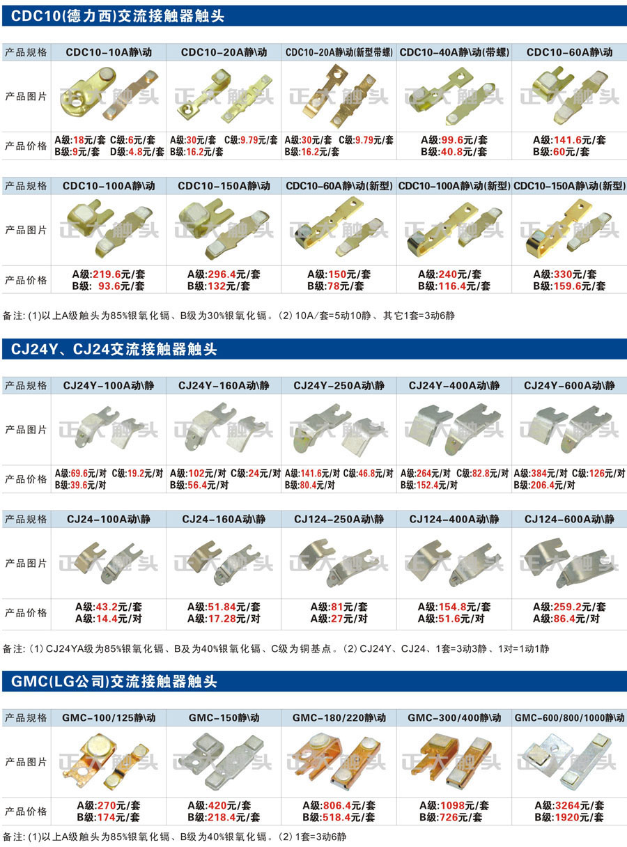 觸頭元件作為電器開關核心元件,主要用于接觸器,繼電器,斷路器,凸輪控制器,補償器,行程開關,腳踏開關,輔助開關等。正火電氣現生產CJT1,CJX1,CJX2,CJX4,CJX5,CJX8(B系列)CJ20,CJ40,CJ12,CJ15,CJ24,CJ24Y,CJ0,CDC10,CJ91,CT91,CJ913,CJ914,CJ3,CJ8Z交流接觸器觸頭,CZ0,CZ1,CZ3,CZ17,CZ18,CG5直流接觸器觸頭,QJ3,QC83補償器觸頭,凸輪控制器,主令觸頭,KT10,KT12,KT14,KTJ1,KTJ5,KTJ6,KTJ15(QT5),LK1,LK17,LK18,THQ1,TQKT等;斷路器觸頭DW10,DW16,DW15,DW17,DW45,DZ10,DZ20,內燃機觸頭,礦用觸頭,叉車,吊車觸頭,JYN1,JYN2,ZN28,SN10,VS1,梅花觸頭等。進口ABB系列AF,EH,EK,富士SC系列,日立H系列,施耐德LC1系列,西門子3TF,3TB系列,LG公司(LS產電)GMC系列,三菱機電SN系列。與國內正泰,德力西,天正,人民等,國外ABB,施耐德,西門子,富士,三菱等廠家電氣配套。
