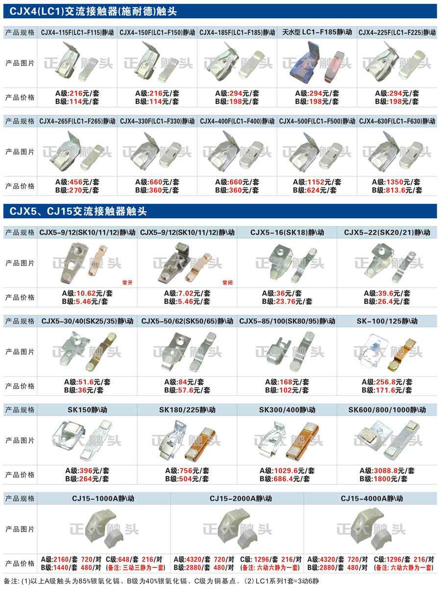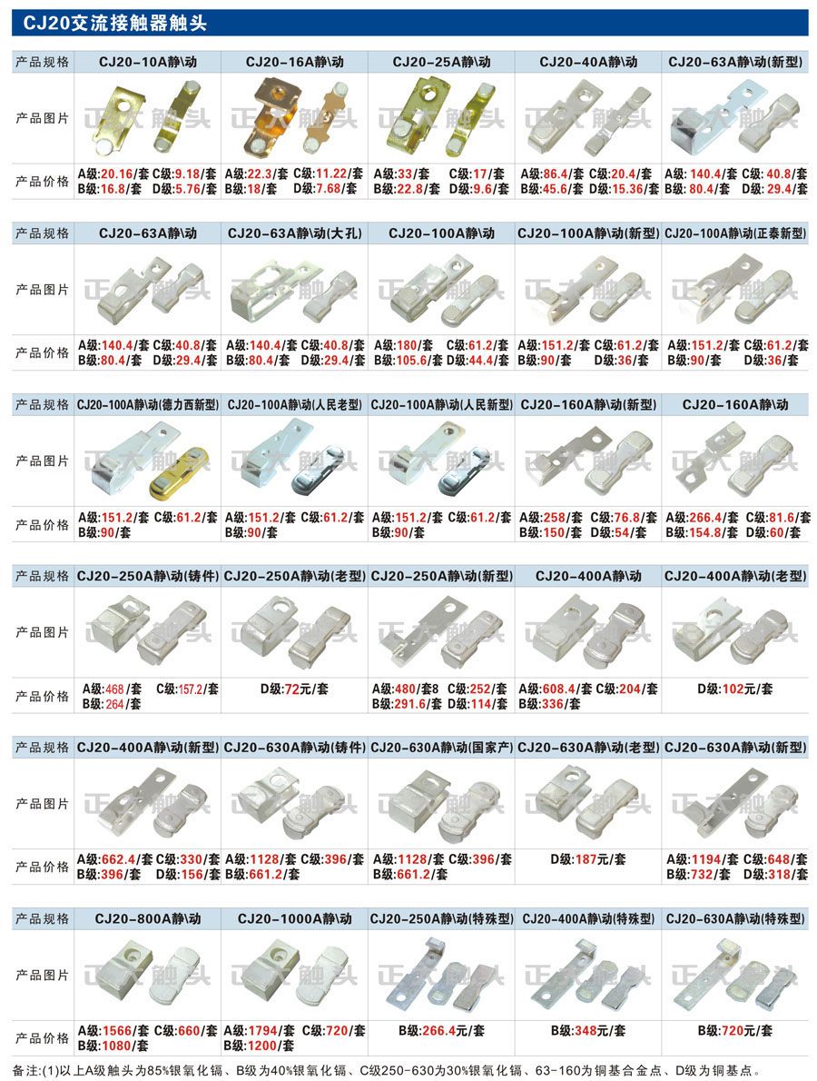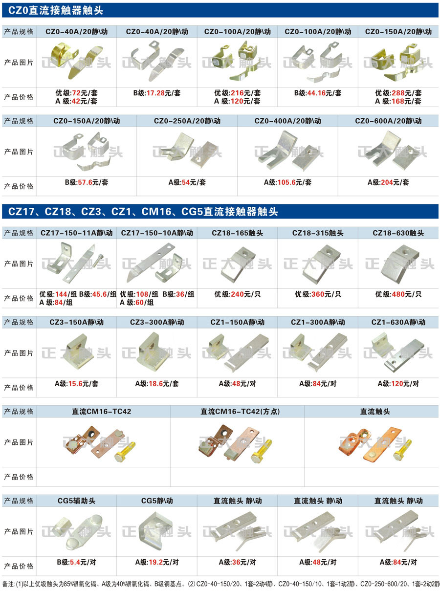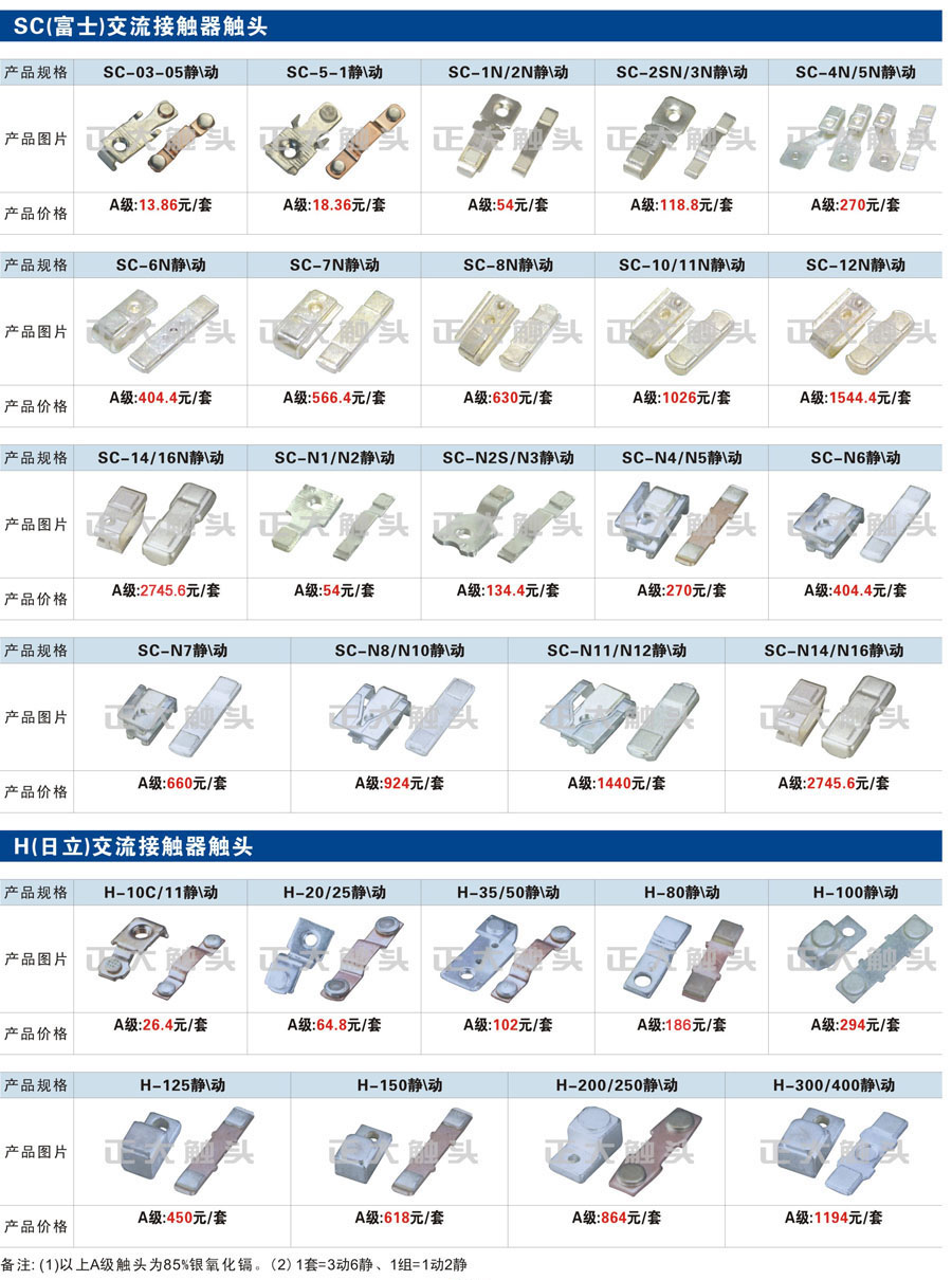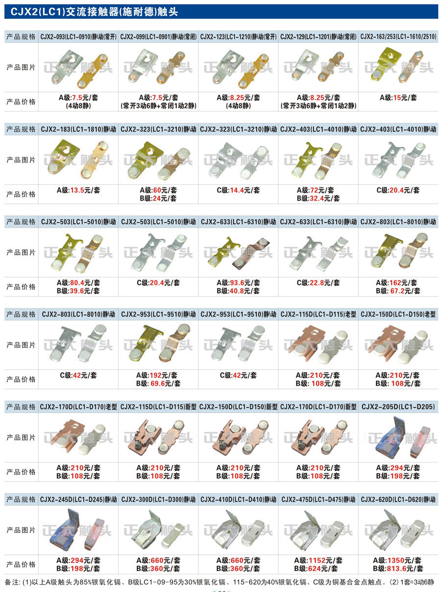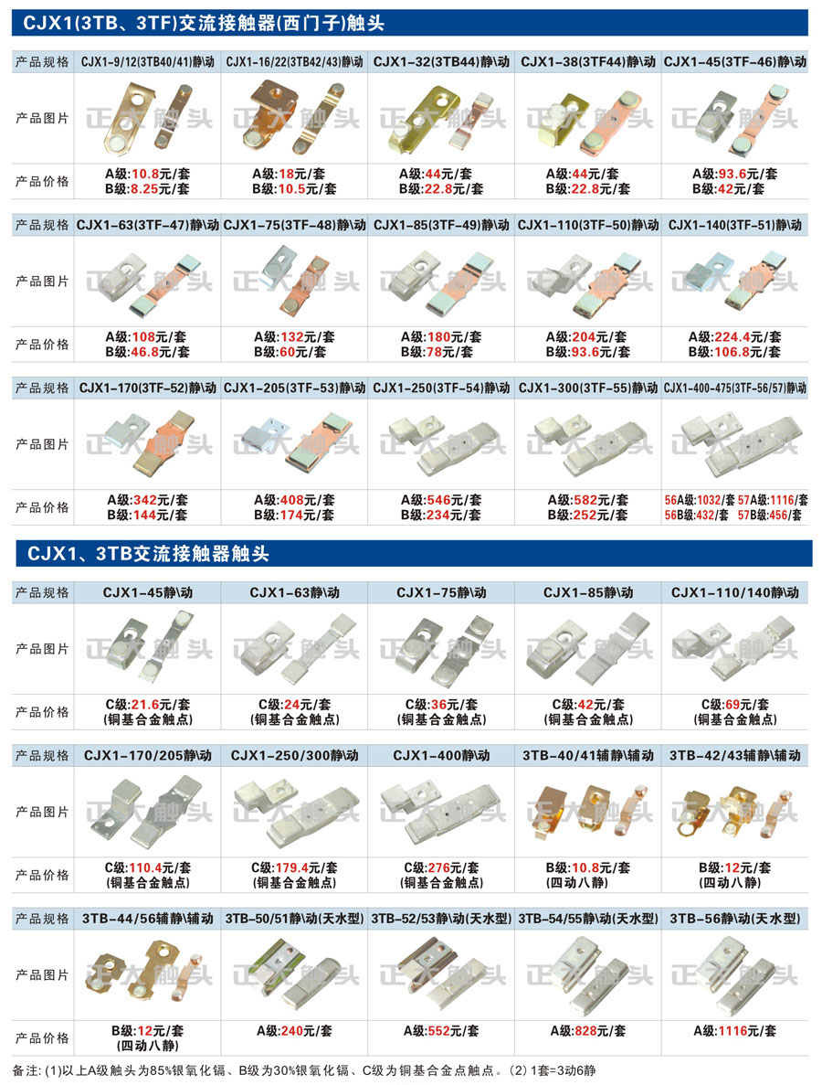 觸頭元件作為電器開關核心元件,主要用于接觸器,繼電器,斷路器,凸輪控制器,補償器,行程開關,腳踏開關,輔助開關等。正火電氣現生產CJT1,CJX1,CJX2,CJX4,CJX5,CJX8(B系列)CJ20,CJ40,CJ12,CJ15,CJ24,CJ24Y,CJ0,CDC10,CJ91,CT91,CJ913,CJ914,CJ3,CJ8Z交流接觸器觸頭,CZ0,CZ1,CZ3,CZ17,CZ18,CG5直流接觸器觸頭,QJ3,QC83補償器觸頭,凸輪控制器,主令觸頭,KT10,KT12,KT14,KTJ1,KTJ5,KTJ6,KTJ15(QT5),LK1,LK17,LK18,THQ1,TQKT等;斷路器觸頭DW10,DW16,DW15,DW17,DW45,DZ10,DZ20,內燃機觸頭,礦用觸頭,叉車,吊車觸頭,JYN1,JYN2,ZN28,SN10,VS1,梅花觸頭等。進口ABB系列AF,EH,EK,富士SC系列,日立H系列,施耐德LC1系列,西門子3TF,3TB系列,LG公司(LS產電)GMC系列,三菱機電SN系列。與國內正泰,德力西,天正,人民等,國外ABB,施耐德,西門子,富士,三菱等廠家電氣配套。