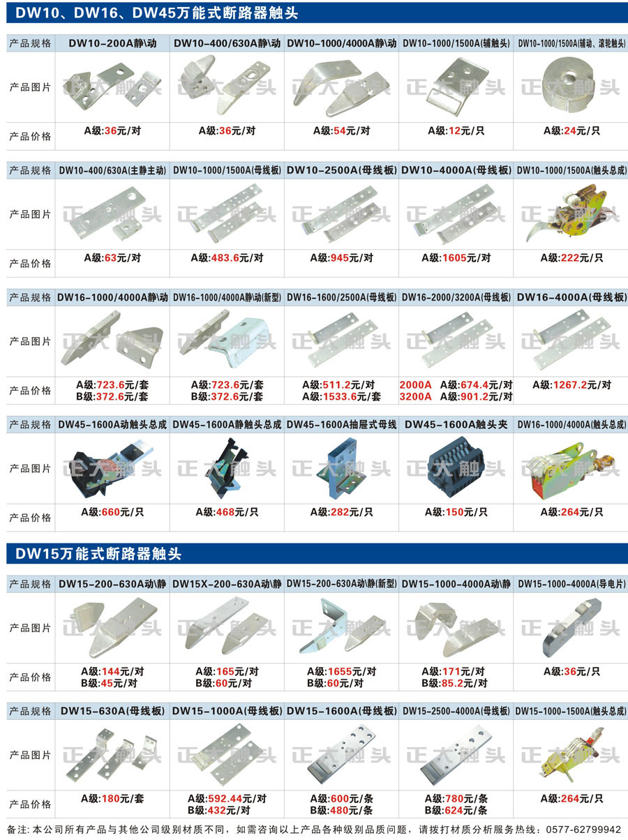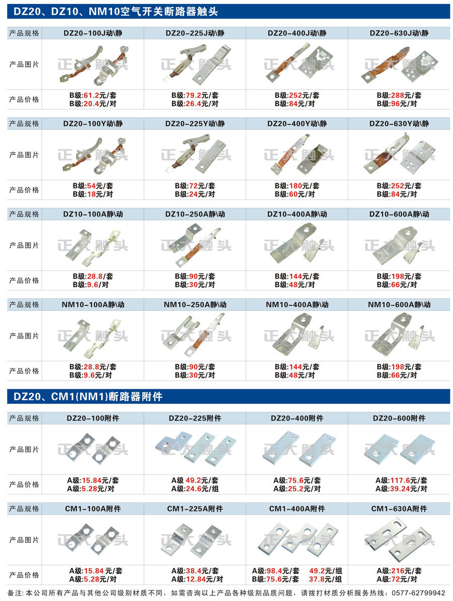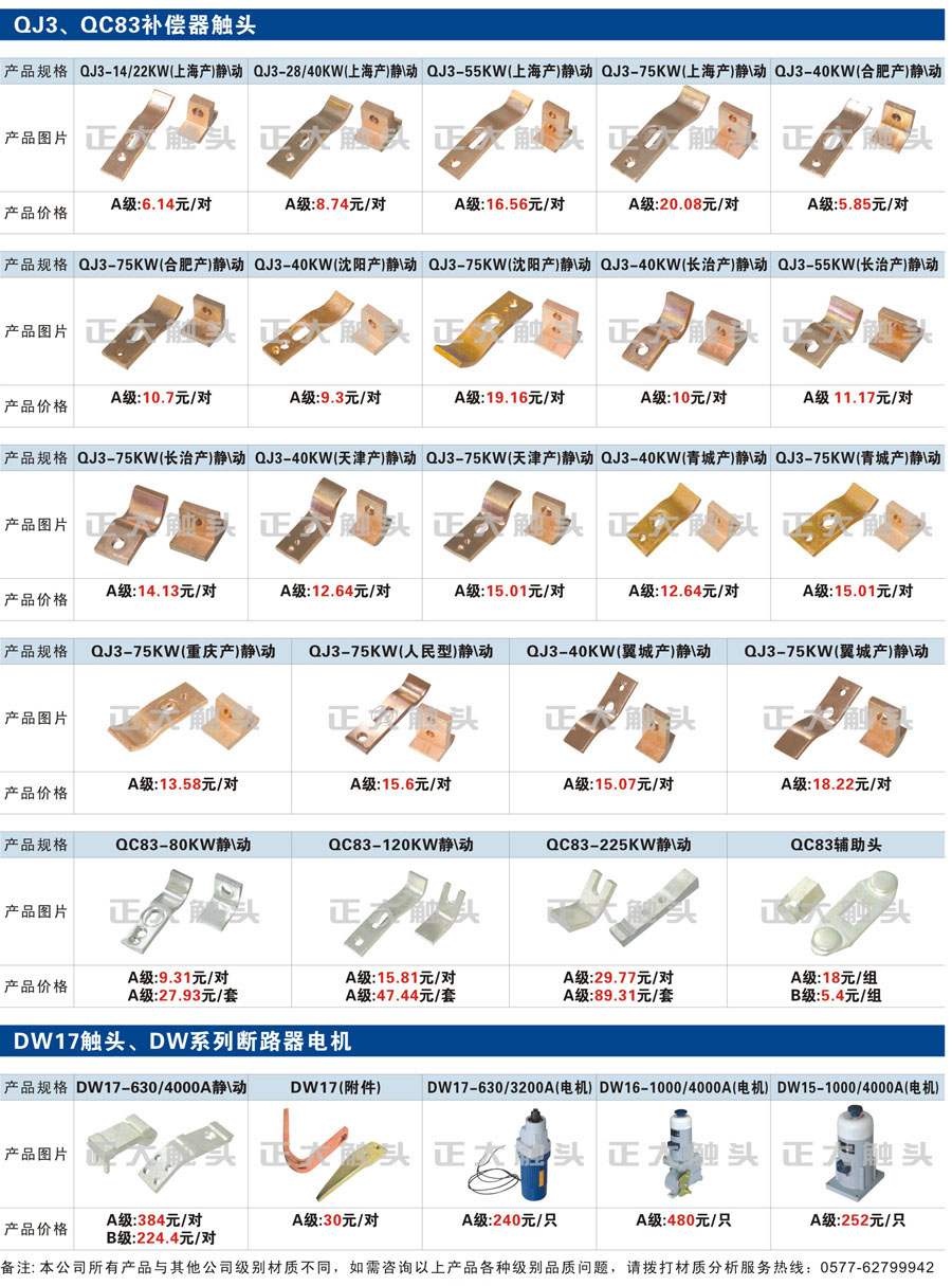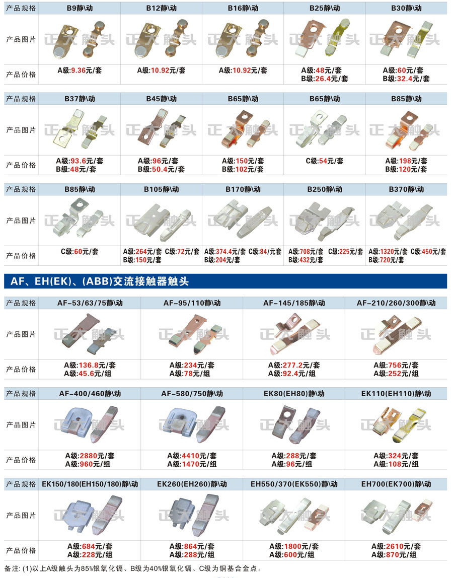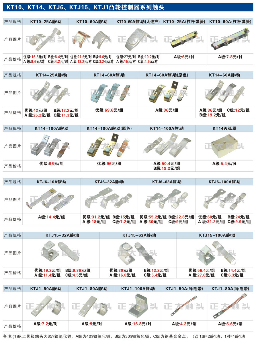 觸頭元件作為電器開關核心元件,主要用于接觸器,繼電器,斷路器,凸輪控制器,補償器,行程開關,腳踏開關,輔助開關等。正火電氣現生產CJT1,CJX1,CJX2,CJX4,CJX5,CJX8(B系列)CJ20,CJ40,CJ12,CJ15,CJ24,CJ24Y,CJ0,CDC10,CJ91,CT91,CJ913,CJ914,CJ3,CJ8Z交流接觸器觸頭,CZ0,CZ1,CZ3,CZ17,CZ18,CG5直流接觸器觸頭,QJ3,QC83補償器觸頭,凸輪控制器,主令觸頭,KT10,KT12,KT14,KTJ1,KTJ5,KTJ6,KTJ15(QT5),LK1,LK17,LK18,THQ1,TQKT等;斷路器觸頭DW10,DW16,DW15,DW17,DW45,DZ10,DZ20,內燃機觸頭,礦用觸頭,叉車,吊車觸頭,JYN1,JYN2,ZN28,SN10,VS1,梅花觸頭等。進口ABB系列AF,EH,EK,富士SC系列,日立H系列,施耐德LC1系列,西門子3TF,3TB系列,LG公司(LS產電)GMC系列,三菱機電SN系列。與國內正泰,德力西,天正,人民等,國外ABB,施耐德,西門子,富士,三菱等廠家電氣配套。