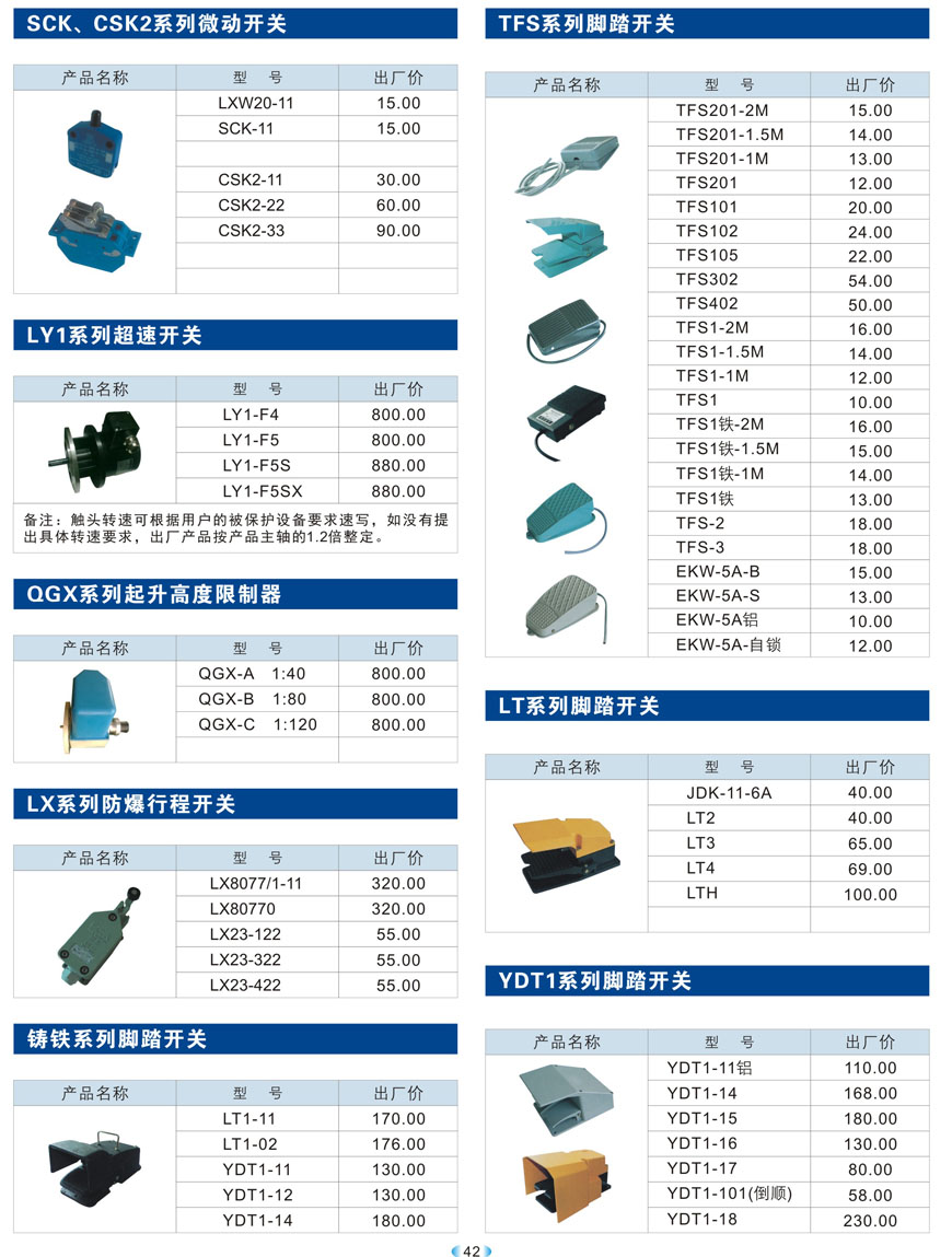 SCK、CSK2系列微動開關、LY1系列超速開關、QGX系列起升高度限制器、LX系列防爆行程開關、鑄鐵、TFS、LT、YDT1系列腳踏開關